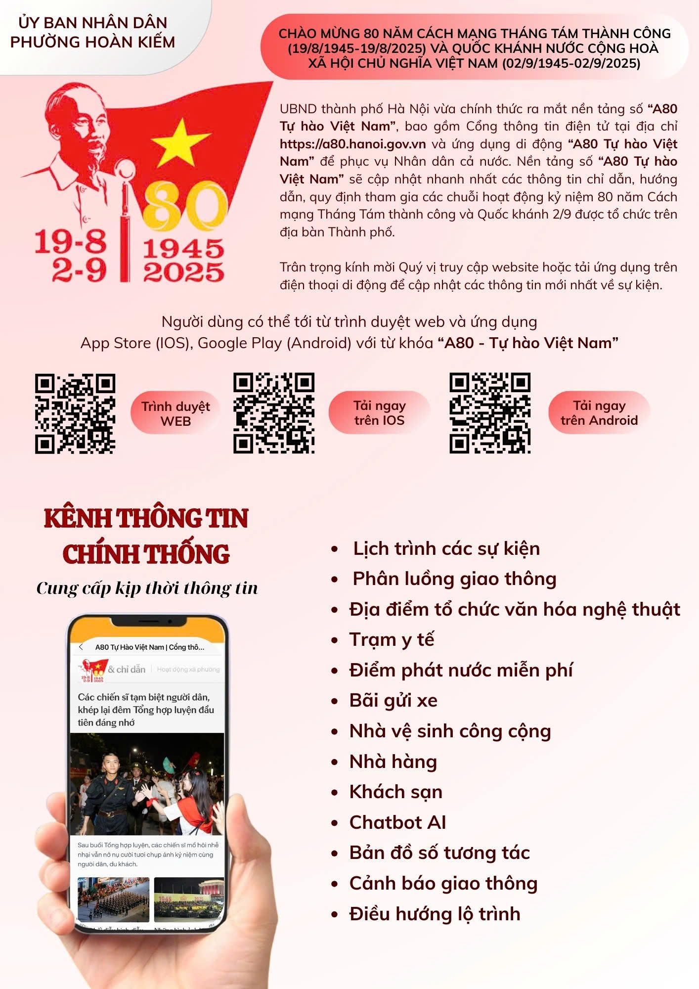UBND thành phố Hà Nội vừa chính thức ra mắt nền tảng số "A80 Tự hào Việt Nam", bao gồm Cổng thông tin điện tử tại địa chỉ https://a80.hanoi.gov.vn và ứng dụng di động "A80 Tự hào Việt Nam" để phục vụ Nhân dân cả nước. Nền tảng số "A80 Tự hào Việt Nam" sẽ cập nhật nhanh nhất các thông tin chỉ dẫn, hướng dẫn, quy định tham gia các chuỗi hoạt động kỷ niệm 80 năm Cách mạng Tháng Tám thành công và Quốc khánh 2/9 được tổ chức trên địa bàn Thành phố.